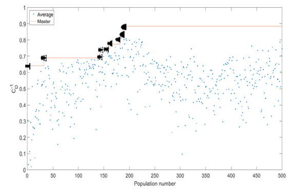Figure 5:Average and the best (master) drag coefficients of different populations in 500 iterations of the modified genetic algorithm.