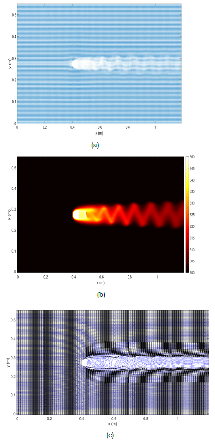 The ability of optimization and also the model numerical predictions for the fluid flow and heat and mass transfers of the present method for a combination of genetic algorithm, image processing and computational fluid dynamic have been validated previously [21-26]. For approving the ability of the presented method in this study, a case study (i.e., obtaining a two-dimensional shape with a minimum drag coefficient in a fluid flow field) with a high calculation time requirement has been presented. The grid independency study of the developed computational fluid dynamic code for this case has been presented in our previous study [25]. Therefore, in this study, our focus is on the performance of a modified parallel genetic algorithm for solving high-time required calculations for obtaining optimum geometries for different optimization targets using the presented method for coupled computational fluid dynamics, genetic algorithm and image processing. As previously mentioned, the presented modified version of the genetic algorithm can find local optimum shape design based on an initially defined geometry. The initial shape has been chosen from our previous study and Figure 4 presents the predictions of the developed computational fluid dynamics for this shape. This Figure has been presented for illustrating some of the computational fluid dynamic abilities of the developed code. Therefore, each one (or multiple combinations) of the fluid, heat or mass flow quantities can be optimized using this method [21-26].