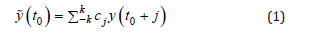 In this formulation, y(t0 + j) represents a data point in the original sequence cj, denotes the corresponding convolution kernel (filter coefficients), and y(t0) signifies the filtered data point at position t0. This process mimics the convolution operation in signal processing, where the kernel slides across the signal while computing weighted sums at each position. For Savitzky-Golay filters, the convolution coefficients cj, are specifically derived from the least-squares optimization of polynomial fitting. These optimized coefficients not only determine the smoothing characteristics of the filter but also ensure preservation of the underlying data trends. The essential mechanism of this convolution operation lies in its sliding-window implementation combined with local polynomial fitting, effectively suppressing high-frequency noise components while retaining the low-frequency signal constituents and original trends.