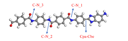 Obabel was used to convert the SMILES string to generate the Aramid III monomer [11]. The molecular structure was preoptimized using MOPAC at the PM6-DH+ level [12-14], and finally, Orca5.0 was employed to calculate the Bond Dissociation Energies (BDEs) of four bonds in the monomer [15]. The preliminary optimized structure facilitates easier geometric convergence and reduces the optimization time under subsequent DFT-level analysis. PM6-DH+ is a modified PM6 method implemented in MOPAC that, compared to previous methods, enhances the description of dispersion interactions and the correction of hydrogen bonds, making it particularly suitable for molecules like Aramid III with strong dispersion effects. Additionally, Korth et al. [12] demonstrated that PM6-DH+ yields slightly improved geometries relative to other semi-empirical methods based on PM6. Geometry optimizations were carried out at the B3LYP-D3/6-31+G* level of theory [16-23], and vibrational analyses were performed at the B3LYP-D3/def2-TZVP level [24]. Previous literature [8,25] has identified the amide bond as having the lowest bond energy in aromatic polyamide structures; therefore, only the changes in bond energy associated with the amide bonds and the newly formed heterocyclic bonds (Figure1) were calculated. Here, the BDE is defined as the standard enthalpy change difference between the whole molecule and its homolytically cleaved fragments. Due to residual discrepancies between Orca-calculated energies and the required thermodynamic enthalpy changes, the Shermo software [26] was used for further thermodynamic calculations. The Orca output files were converted with Multiwfn [27,28], the Shermo temperature was set to 278.5K, and the correction factor was adjusted to 0.9850 [29].