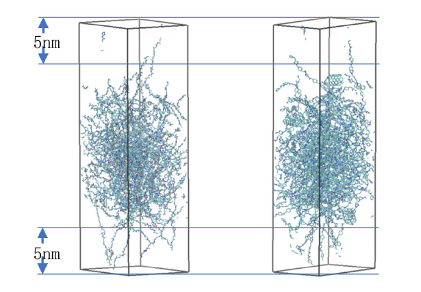 Figure 2:The picture on the left shows pure aramid III fiber. On the right is a simulation diagram of 3 wt% carbon nanotube-doped aramid III fiber.