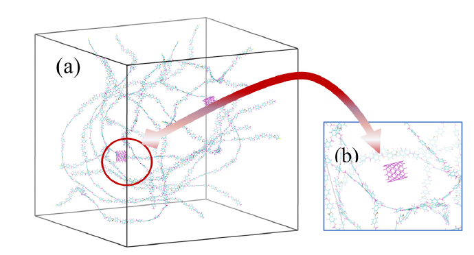 To investigate the correlation between binding energy and conformational evolution in Carbon Nanotube (CNT)/Aramid III composites, we constructed a 3wt% CNT-incorporated Aramid III model using the GAFF force field. To rigorously quantify the interaction energy of short-fiber CNTs, two CNTs were strategically incorporated within a single system. Given the system’s high rigidity, MMFF94 charges were employed for distribution [35]. Considering the viscoelastic nature of polymers and restricted molecular chain mobility, combined with the computational demands of all-atom force field simulations involving tens of thousands of atoms, the initial configuration was generated using Packmol. This involved random dispersion of 16 aramid chains and two 1-nm CNTs within a 20×20×20nm³ simulation box [36].