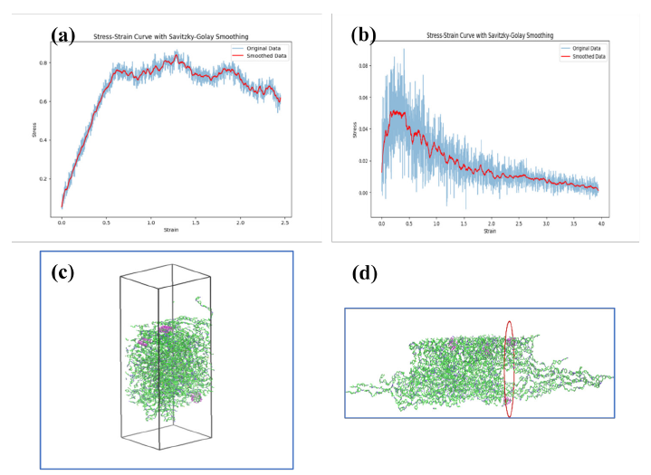 Polymer simulations present significant computational challenges due to their inherent memory-intensive nature from high molecular weights, demanding specialized software solutions. Critical force field parameter matching was addressed through complementary use of GROMACS (GROningen MAchine for Chemical Simulation) [38] and LAMMPS (Large-scale Atomic/ Molecular Massively Parallel Simulator). While GROMACS benefits from extensive automated tools and broad user adoption, LAMMPS excels in materials simulation through comprehensive potential support (e.g., EAM for metals) and versatile deformation capabilities. We developed an interoperability script bridging these platforms via Moltemplate, LAMMPS’s molecular preprocessing tool [39], enabling seamless conversion of GAFF-parameterized GROMACS.gro files into Moltemplate.lt format.