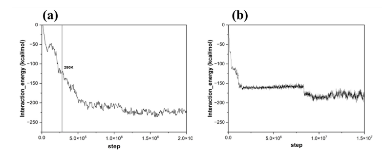 Figure 5:(a) A binding energy curve with a warming rate of 10K/ps, the structure is stable in subsequent NPT equilibrium; (b) A binding energy curve with a warming rate of 0.15K/ps, the structure is in equilibrium very early, with only minor adjustments thereafter.