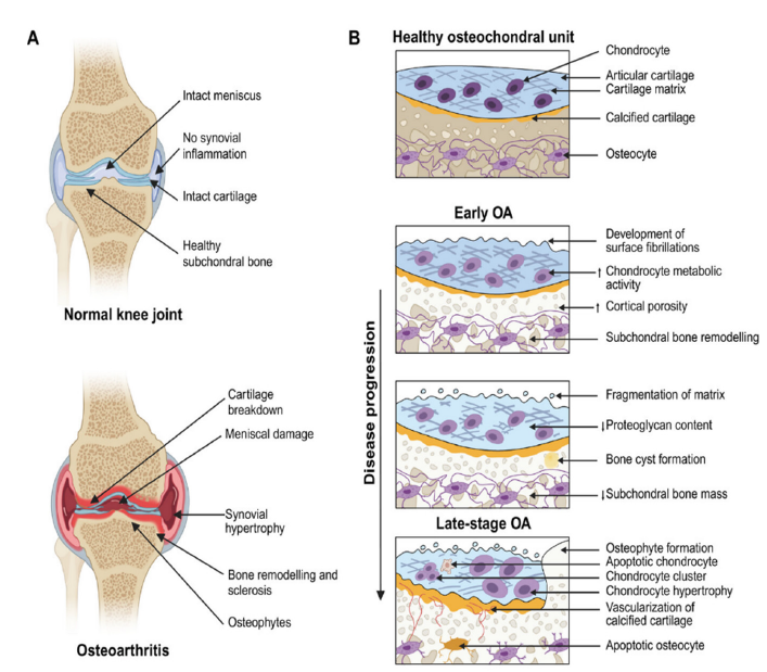 A) Schematic comparing a normal knee joint with Osteoarthritis (OA). B) Schematic comparing a healthy osteochondral unit with the changes in the osteochondral unit during OA progression. OA is characterized by chronic inflammation, cartilage damage due to mechanical and proteolytic degradation, and abnormal subchondral bone formation, leading to the formation of bony outgrowths into the joint capsule referred to as osteophytes (Figures 2 & 3).