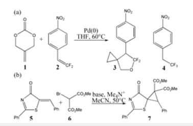 Figure 1:(a) Pd(0)-catalyzed spirocyclopropanation of π-allylpalladium 1,4-dipole 1 with gem-difluoroalkene 2 leading to gem-difluorinated oxa/azaspiro[2.4]- heptane 3, (b) 1,4-addition-induced dearomatization of 5-alkenylthiazolone 5 with 2-bromomalonate 6 giving spirocyclopropylthiazole 7.