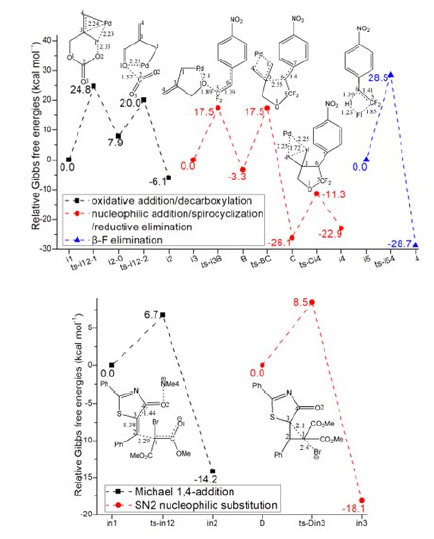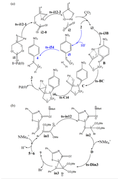 The mechanism was explored for Pd(0)-catalyzed spirocyclopropanation of π-allylpalladium 1,4-dipole 1 with gem-difluoroalkene 2 leading to gem-difluorinated oxa/ azaspiro[2.4]-heptane 3 and 1,4-addition-induced dearomatization of 5-alkenylthiazolone 5 with 2-bromomalonate 6 giving spirocyclopropylthiazole 7 (Figure 1). On one hand, illustrated by black arrow of Figure 2a, initially the π-allylpalladium 1,4-zwitterionic species was given by oxidative addition of 1 to Pd(0) and decarboxylation. Then via nucleophilic addition, the electrophilic gem-difluorinated carbon atom of 2 was attacked by anionic oxygen forming zwitterionic intermediate B, which underwent intramolecular spirocyclization through the attack of anionic carbon to central carbon of π-allylpalladium giving palladacyclobutane C with five-membered ring. The product 3 was finally obtained with three-membered ring via reductive elimination of C as well as the regenerated Pd(0) species. Added by HF, the competitive β-F elimination also existed from 2 yielding trifluoromethyl 4 as by-product (blue arrow of Figure 2a).
