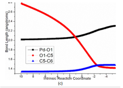 In step 2, decarboxylation is completed via the disrupture of O1-C2 bond via ts-i12-2 with activation energy of 12.1kcal mol−1 exothermic by -6.1kcal mol−1 leading to i2. The transition vector corresponds to the approaching of Pd to O1 and the resulting elongation of O1···C2 (2.25, 1.57Å) (Figure 4b). Besides formal CO2 molecule, the π-allylpalladium 1,4-zwitterionic species is located as stable five-membered ring with Pd-C1 and Pd-O1 single bond. It is rational for positive Pd linked with negative O1, which is relation flexible in following process.