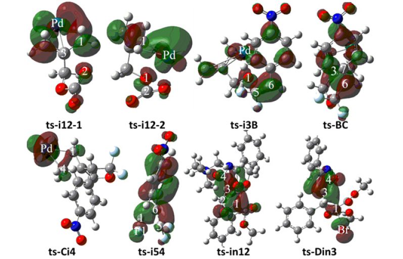 Ultimately, the first step of decarboxylation is determined to be rate-limiting for Pd(0)-catalyzed spirocyclopropanation. The mediate barrier and heat release confirm this favorable strategy under the assistance of Pd(0) especially considering the experiment temperature of 60 °C. To highlight the idea of feasibility for changes in electron density and not molecular orbital interactions are responsible of the reactivity of organic molecules, quantum chemical tool Multiwfn was applied to analyze of electron density such as MBO results of bonding atoms and contribution of atomic orbital to HOMO of typical TSs (Table 4, Figure 5). These results all confirm the above analysis.