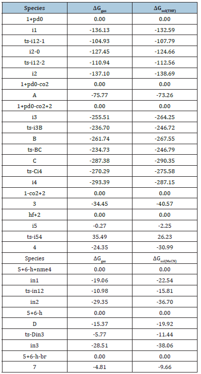 The geometry optimizations were performed at the B3LYP/ BSI level with the Gaussian 09 package [26,27]. The mixed basis set of LanL2DZ for Pd and 6-31G(d) for non-metal atoms [28-32] was denoted as BSI. Different singlet and multiplet states were clarified with B3LYP and ROB3LYP approaches including Becke’s three-parameter hybrid functional combined with Lee-Yang-Parr correction for correlation [33-39]. The nature of each structure was verified by performing harmonic vibrational frequency calculations. Intrinsic Reaction Coordinate (IRC) calculations were examined to confirm the right connections among key transition-states and corresponding reactants and products. Harmonic frequency calculations were carried out at the B3LYP/BSI level to gain Zero- Point Vibrational Energy (ZPVE) and thermodynamic corrections at 333, 323K and 1 atm for each structure in THF, acetonitrile. The solvation-corrected free energies were obtained at the B3LYP/6- 311++G(d,p) (LanL2DZ for Pd) level by using integral equation formalism polarizable continuum model (IEFPCM) in Truhlar’s “density” solvation model [40-42] on the B3LYP/BSI-optimized geometries.