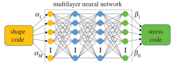 Once the datasets have been generated, multi-layer neural network was designed using open source codes from the python scikitlearn library. The codebase was based upon regression to map the shape code that was then placed into a neural network that mapped the shape code into the stress code that is essentially a non-linear regression with high dimensional outputs. βn=f(α1,….αm) with n=1, 2, 3 and so on. The structure of the neural network is illustrated in Figure 6 and has been simplified with two layers each of which has 128 nodes.