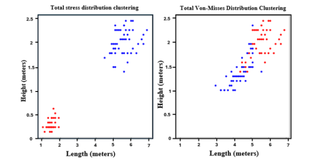 Given that singular vectors are orthogonal to each other, it has been possible to reduce complexity and each sub-networks share the same weight and hence the stress code can be implemented via a transposed-convolution layer [31]. While the stress encoding can be implemented via a neural network with convolution layers [32]. Following mapping of the geometry and fluid filed and encoding and decoding of the stress distribution the deep learning was applied by the use of k-means clustering. Using a python scripts, the material property dataset was generated and used as target test data whilst the output stress distribution dataset was used for training purposes. Clustering output a plot that would predict high stress point locations values for the given sample.
