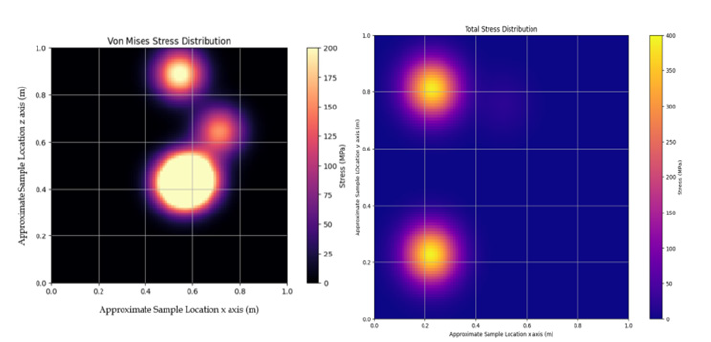 The final step that python mat-plot library [35] output as a result is a maximum total stress of 400 MPa. These results are in-line with the previous study based on finite element modelling when applied with known initial conditions of atmosphere re-entry conditions [3,36]. Figure 9 illustrates the stress distribution map, and it could be observed that the map mimics the average results of 16 mean cluster on the total stress distribution (Figure 8 (left)) and Von-Mises distribution (Figure 8 (Right)) for the ZrB2 - SiC material dataset (Figure 9).