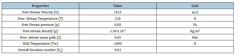 Table 2 summarizes the initial and boundary conditions that have been utilised to obtain the thermo-fluid profile and the subsequent dataset with free steam velocity, temperature, pressure and density which are the typical values that a re-entry vehicle would face, the wall temperature is assumed to be circa 1000 K. The use of the Monte Carlo method to compute the transient hyper-velocity reacting flow in a vacuum employs the non-equilibrium Navier- Stokes-Fourier equations [21]. Therefore, in cartesian coordinates, the flux-divergences (W) are given by: