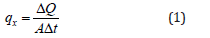 The heat conduction, as shown in Figure 1, refers to energy transfer due to temperature gradients without any bulk motion of the fluid. In fluids, molecules transport thermal energy by collisions and interactions. This microscopic activity is modelled macroscopically by Fourier’s law. The law states that the heat flux qx is the rate at which heat transfer per unit area: