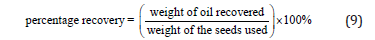 The round-bottom flask was disconnected from the Soxhlet apparatus, and the solvent-oil mixture was poured into a beaker. Finally, the oil was recovered from the mixture with the aid of a rotary evaporator. The extracted oil was collected and stored in a clean airtight container, away from light and heat, to prevent oxidation and degradation. The percentage recovery was used instead of percentage yield because no chemical reaction took place during the extraction. It was calculated using equation (9):