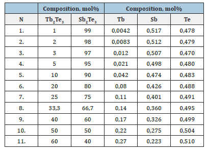 Table 1:Expression of the compositions of Sb2Te3- Tb2Te3 system alloys.