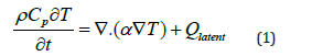 where ρ is the material density, Cp is the specific heat capacity, T is the temperature, t is the time, α is the thermal conductivity, and Qlatent represents the latent heat release. The corresponding solidification kinetics are described by the well-known Scheil model [10]: