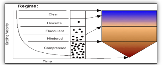 Hi-rate thickener (solid-liquid separation): Another separation unit, HRT (high rate thickener) is used in plants to increase the solid concentration of feed subjected to leaching by sedimentation. The addition of flocculating agent in HRT improves the sedimentation process. After hydrocyclone operations, the slurry enters into a thickener in which clear overflow water is recycled back to the plant and thickened underflow goes for further processing on horizontal belt filters. Settling regimes depend upon the closeness of particles to each other which is defined in Figure 5; [29].
