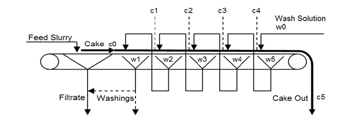 Filtration (solid-liquid separation) after leaching: After leaching, the leached slurry is filtered again using HBF for extraction of the desired mineral from solid to liquor form. Solid with unleached mineral goes to tailings for disposal and filtrate moves for further chemical processing. Figure 7 represents a description of several counter-current steps being used to increase the concentration of liquor. It is very important in the case of low-grade ore. The required concentration of liquor helps in the precipitation of fine particles more efficiently [35]. In Figure 7, c0, c1, c2, c3, c4, and c5 are five stages for counter-current washing zones of HBF, and w0, w1, w2, w3, w4, and w5 are known as weak liquor filtrates being collected from all zones.