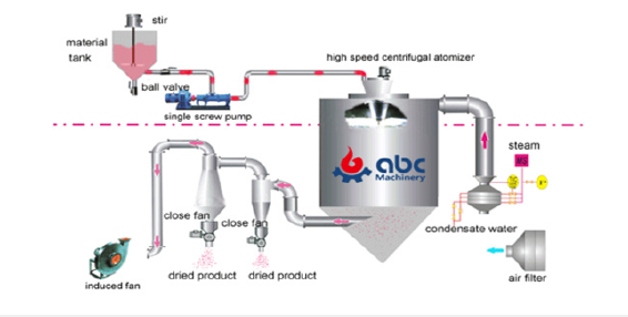 Product drying (solid-moisture separation): Repulped product cake enters into the drying chamber/atomizer from the top as mentioned in Figure 8. Hot air passes from one end with the help of an FD fan. Product slurry converts into powder form within a fraction of a second due to the very high rotation speed of the motor situated at the top of the atomizer. A bag filter and HEPA filter are being used in between drying operations [40,41].