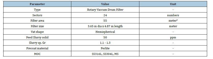 Table 2:Technical specification of precoat / drum filter [36].