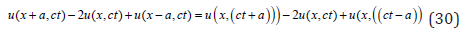 In view of the above discussion, Equation (14) is not mathematically tenable. The time t in Equation (14) must be digital and hence, the second derivative of u(x,t) with respect to t, on the righthand side of Equation (14), does not exist. As a consequence, we replaced it by the second difference. Hence, Equation (14) is replaced by Equation (30), in the manner shown below.