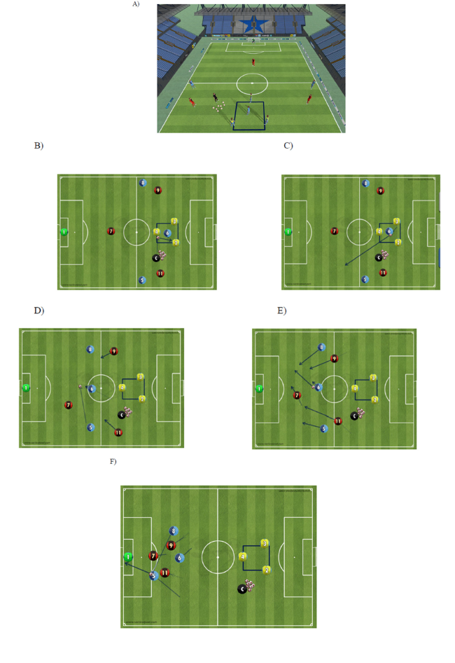 Figure 1:Specific offensive-defensive drill (3v1 high pressure and counter-attack): a) 3D drill set up; b) 3v1 possession where player nr 6 (blue) applies high pressure to win the ball; c) once possession has been re-gained, counter-attack is initiated; d) 3 blue players counter-attack and 1 red defends (3v1); e) 2 red players are making recovery runs to support defense (3v3); f) blue players quickly enter the box to finish an attack, which must be performed as quickly as possible to use numerical advantage in its early phase. Perform 2 sets of 6-8 actions lasting 20-30 seconds. Use 1:2-3 work-to-rest-ratio. Group activity: 9-15 players. Perception/Anticipation/Reaction. Adopted from Bortnik L [14].