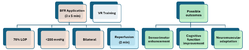 Virtual Reality (VR) provides a computer-generated threedimensional environment accessed through head-mounted displays and motion controllers, creating an immersive sense of presence in virtual space [32]. VR has been applied in both clinical and sporting contexts to enhance motor and sensory function, cognitive processes and perceptual skills, all of which play a critical role in decision-making in team sports [33]. Research has demonstrated that movement patterns and motor control are largely comparable between physical environments and virtual conditions [34]. Furthermore, VR has proven effective in the evaluation and rehabilitation of gait [35], highlighting its potential as both an assessment and training tool. This technique is particularly valuable when physical loading must be limited, for example during injury rehabilitation or recovery phases in a weekly microcycle in soccer [26]. Although BFR and VR have each demonstrated significant promise, no studies to date have examined their combined use in sport [36]. Conceptually, their integration could provide synergistic benefits, enhancing proprioception, motor and cognitive skills, postural control and physiological adaptations such as muscle size, strength and endurance (Figure 4b). A potential protocol (Figure 5) could involve applying BFR at ~70% limb occlusion pressure (LOP; <200mmHg) bilaterally, as recommended by Neal BS et al. [24], for 3 sets of 5 minutes during VR training, interspersed with 2-minute reperfusion periods [21]. This combined approach may augment both sensorimotor and cognitive outcomes while supporting neuromuscular adaptation. Future research should examine this novel paradigm with particular attention to its relevance for soccer performance, rehabilitation and recovery [37].