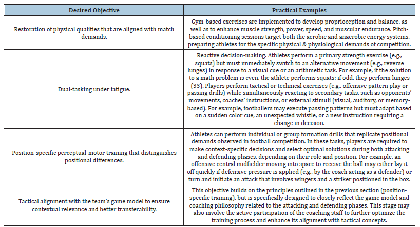 Practitioners might ask how visual-cognitive aspects could be applied in practical settings. In real-match scenarios, the concepts of anticipation and reaction can be utilized in various ways to enhance player performance and impose professional development. Table 2 & 3 depict real-world situations that offensive and defensive positions could experience during official matches. In practical settings, embedding visual-cognitive processes in individual and team-based training, including rehabilitation and Return-to-Play (RTP) protocols, is essential for a holistic and safe transition back to full match performance. When injuries limit movement and on-pitch sessions are not possible however, alternative approaches must be considered. A notable example is an Anterior Cruciate Ligament (ACL) injury. It is worth noting that rupture and reconstructive surgery lead to a disruption of sensory input from the knee to the Central Nervous System (CNS), resulting in altered motor behaviours [10]. Consequently, ACL injury should be regarded as a multifaceted musculoskeletal condition, as it encompasses not only mechanical and movement impairments but also cognitive and neurological disruptions. Failing to address these dimensions within rehabilitation, prevention and risk assessment strategies may result in incomplete management and a higher likelihood of recurrent problems [11]. In such cases, a long recovery and multi-staged rehabilitation are required, gradually transitioning from gym-based to pitch-based specific exercises [12] (Figure 1). Rehabilitation, even at early stages, should include tasks that challenge attention, working memory, and visual-spatial processing as shown in Figure 2 & 3. Training plans at more advanced stages must consider the individual’s characteristics and positional demands, where soccer players anticipate, decide and quickly react to constantly changing environments that mimic game-like scenarios [12-15]. For instance, developing the ability to press aggressively, win the ball high and transition instantly into attack has been considered a decisive factor in modern soccer [13]. Figure 1 presents a drill designed to connect defensive pressing behaviors with a quick counter-attack, emphasizing perception, anticipation and reaction in high-tempo game situations. The main aim during this exercise is to condition players for repeated high-intensity efforts in realistic scenarios while enhancing individual and collective awareness in attack and defense [14]. Another practical and progressive approach is the Visual-Cognitive Control-Chaos Continuum (VC-CCC) proposed by Taberner and colleagues [15]. This framework outlines how RTP strategies can progressively integrate various physical and cognitive objectives, which is shown in Table 4. By adopting such structured, cognitively integrated training frameworks, practitioners can maximize the RTP protocols and better prepare athletes for complex, fast-paced scenarios of modern soccer and ultimately enhance their readiness for the match demands.