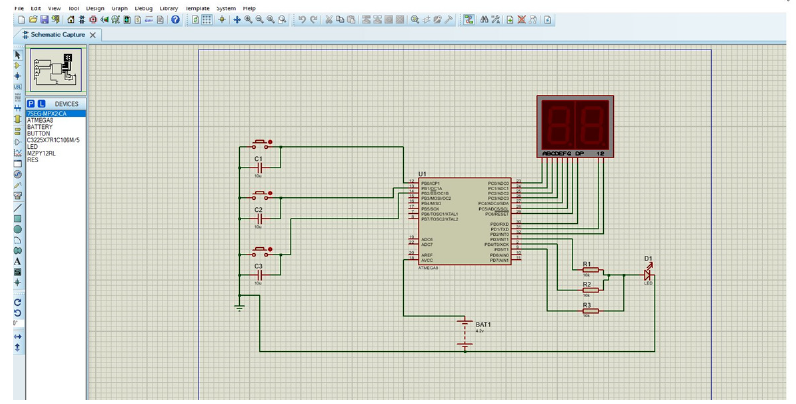 Circuit software simulation: The initial design is simulated by using the Proteus software. In this way, program code is loaded on the IC. Then the display of the keys and other components are simulated and connected to the microcontroller (Figure 4). The coding of the device should be done according to the design done in Proteus and the desired bases should be determined as input and output. The codes of this program are written with the help of the code wizard tool and are fully compatible with the selected micro (Figure 5).