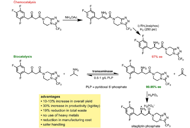 Figure 3:Enzymatic (biocatalytic) synthesis of sitagliptin [55].