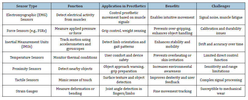 Feedback can be categorized into various strategies: eventcentric feedback is triggered solely by specific occurrences, such as object contact or slippage; continuous feedback is delivered in accordance with real-time sensor inputs, such as grip strength; and location-specific feedback correlates sensor data to particular regions of the skin to improve spatial awareness [4]. Feedback is normally supplied to the residual limb, but alternate places such as the contralateral limb, chest, or back are also examined for more effective sensory mapping [4]. The incorporation of these haptic feedback systems provides several advantages, such as improved grip force management, enhanced item manipulation, heightened spatial and kinetic awareness, and alleviation of phantom limb pain [4-5]. Moreover, it fosters an enhanced sense of embodiment and psychological comfort for users. The integration of touch sensors and sophisticated haptic feedback systems signifies a pivotal transition from passive prosthetic devices to dynamic, responsive smart prosthetics, greatly improving their functionality and user acceptance [4,5,7,13]. Table 3 highlights the Types and Roles of Embedded Sensors.