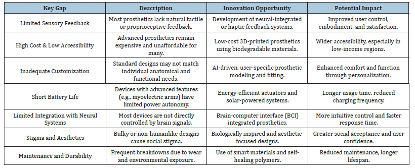 Although intelligent prosthetics are initiating a novel epoch of user-interactive, anatomically adaptive mechanical limbs, significant issues in power efficiency, user training, and technological resilience require resolution [10,16,18,19]. Addressing these disparities necessitates ongoing research, user-centric design, and scalable manufacturing technologies to completely actualize the promise of prosthetics that restore both functionality and feeling. Recent comprehensive reviews have systematically examined the manufacturing challenges associated with 3D-printed robotic prostheses [19]. These challenges encompass material limitations, precision requirements in additive manufacturing, integration of electronic components, and quality control protocols [19]. Addressing these technical barriers is essential for advancing the reliability, durability, and accessibility of next-generation prosthetic devices. Future innovations must focus on developing standardized manufacturing protocols, improving material properties for long-term biocompatibility, and establishing rigorous testing frameworks to ensure consistent performance across diverse manufacturing platforms [19]. Table 5 shows the Key Gaps and Innovation Opportunities while Figure 2 presents the Design Roadmap for Future Prosthetics.