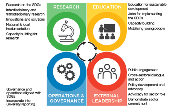 Furthermore, given the critical role universities have in ensuring the success of the SDGs, universities have a moral imperative to embody support for the SDGs as part of their social missions and core functions. Figure 1 provides an overview of the key contributions universities can make to realize SDGs. Firstly, the SDGs recognise the importance of education to sustainable development through SDG 4, which calls for providing “inclusive and equitable quality education and promoting lifelong learning opportunities for all.”