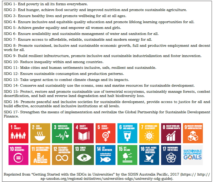 In 1987, the Bruntland Commission published its report, Our Common Future, in an effort to link the issues of economic development and environmental stability. In doing so, this report provided the oft-cited definition of sustainable development as “development that meets the needs of the present without compromising the ability of future generations to meet their own needs” (United Nations General Assembly, 1987, p. 43). In September 2015, 17 Sustainable Development Goals (SDGs) and their associated 169 targets were agreed by 193 United Nations’ (UN) member countries to achieve sustainable development and they are to be met at the end of 2030 which refer as the Global Goal or Agenda 2030. The SDGs cover a wide range of complex social, economic, and environmental challenges and addressing them will require transformations in how societies and economies function and how we interact with our planet (UN, 2015). Education, research, innovation and leadership will be essential in helping society address these challenges. Universities, with their broad remit around the creation and dissemination of knowledge and their unique position within society, have a critical role to play in the achievement of the SDGs (SDSN, 2017). Table 1 illustrates 17 SDGs which are also sometimes referred as the Global Goals.