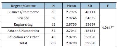 Further for each response on the Likert scale a score was assigned (EA= 5, MA = 4, SWA= 3, SA= 2, NAA= 1) and based on those assigned values ANOVA calculations were done to compare between the degree/course the relevant academic is involved in and awareness/perceptions of SDGs among academics. The demographic factor of degree/course of the relevant academic was selected for ANOVA comparisons by assuming that the results will highlight awareness and perception differences across disciplines if any.