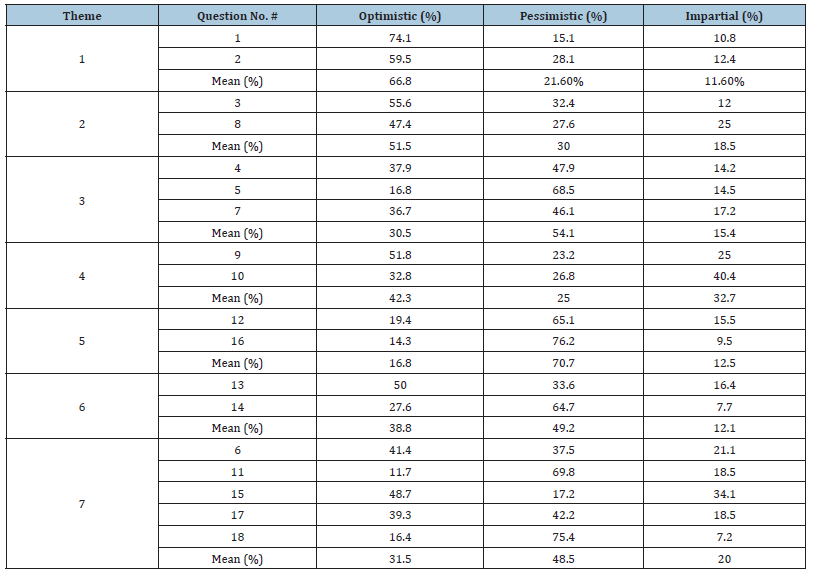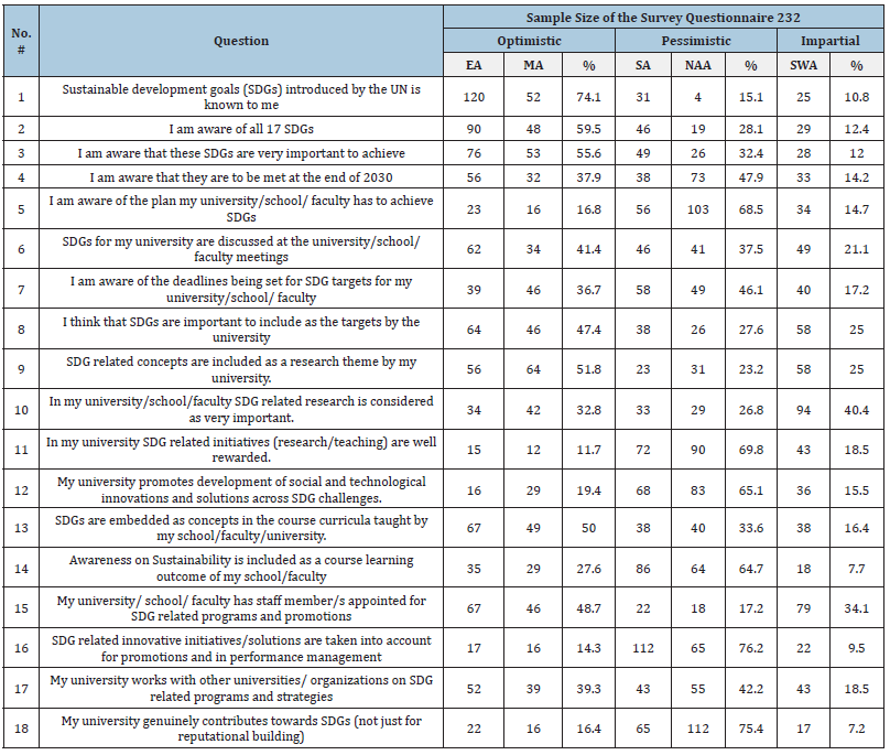 Analysis was conducted using descriptive statistics in Excel (percentages for overall totals) and using univariate analysis of variance (ANOVA) for comparisons between degree/course of the relevant academic is involved and awareness/perceptions of SDGs among academics. Based on the percentages given in Table 2 and themes identified in the section 2 of this paper results on awareness and perceptions can be summarized as follows (Table 4). The mean value of each theme is calculated by considering percentages of optimistic, pessimistic and impartial responses given for related statements in the survey questionnaire.