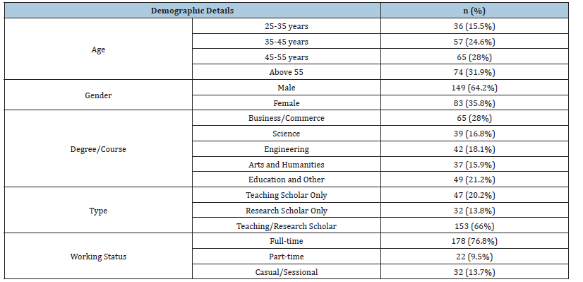 In this regard, all the public universities of Australia were contacted via emails in 2019 from June to August. The survey invitations were sent to the concerned faculties/schools to forward the questionnaire to their academics as a soft copy. The survey questionnaire was adapted from the work of Malik et al [3], Penzenstadler [4] and Sunthonkankopang [1]. After modifying and aligning the contents of the questions with the aim of this survey, the developed questionnaire was validated for its content and face validity. Piloting of the questionnaire was done via fellow researchers, and their recommendations were amalgamated accordingly. The questionnaire validation was done through Average Congruency Percentage (ACP), and Content Validity Index (CVI). In this regard, five experts from academia were contacted. However, only three academics participated. The predefined criteria of experts included having more than five years of experience, must be involved in an SDG related project/s and have sound knowledge about sustainability development. In ACP, academics calculated the percentage of questions thought to be appropriate for them. In CVI, the content validity index for the individual item (I-CVI) was calculated. The questions were rated for their relevance. Expert 3 rated two out of 18 questions unrelated, resulting in 88.9% relevancy at their level. Expert 1 and expert 3 found all questions relevant, resulting in a 100% relevancy rate at their level. The experts’ average value of congruency percentage was 96.3%, which was considered as valid. For CV I, the same experts were requested to assess each question’s content relevance on a 4-point Likert scale. Where 1 = not related, 2 = somewhat related, 3 = related, 4 = strongly related. To decide the measures for relevance, the experts’ rating 3 or 4 was considered as related, and 1 or 2 was considered as not related. The mean I-CVI value of questions by the experts was 0.87, and the Mean Expert Proportion was calculated as 0.87. The results of ACP and I-CVI showed a high face and content validity of the questionnaire, hence certifying the quality of the instrument. The questions and their responses by the survey participants (232 participants) are described in the Table 2. A five-point Likert scale was used that consists of Extremely Aware (EA), Moderately Aware (MA), Somewhat Aware (SWA), Slightly Aware (SA), and Not at All Aware (NAA). The socio-demographic details of the participants are shown in Table 3. The demographic variables of the participants are Age, Gender, Degree/Course, Level, and Working Status.