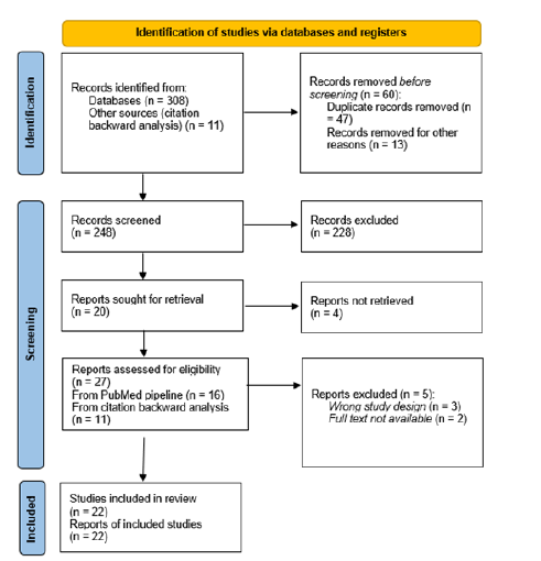 Studies were included based on predefined inclusion and exclusion criteria. Eligible studies met the following criteria: [1] investigated the use of fibrin sealants in intracranial hemostasis or dural closure, [2] reported clinical or surgical outcomes and [3] were Randomized Controlled Trials (RCTs), cohort studies, reviews or case series. Studies focusing solely on animal models or non-surgical interventions were excluded, as well as non-English publications and studies lacking clear patient outcomes. Screening was performed in two phases: Title and abstract screening, followed by full-text review. After applying the inclusion criteria and quality assessment, 11 studies were considered eligible. An additional 11 studies were identified through backward citation analysis, bringing the total number of included studies to 22. A PRISMA-style flow diagram (Figure 1) summarizes the selection process.