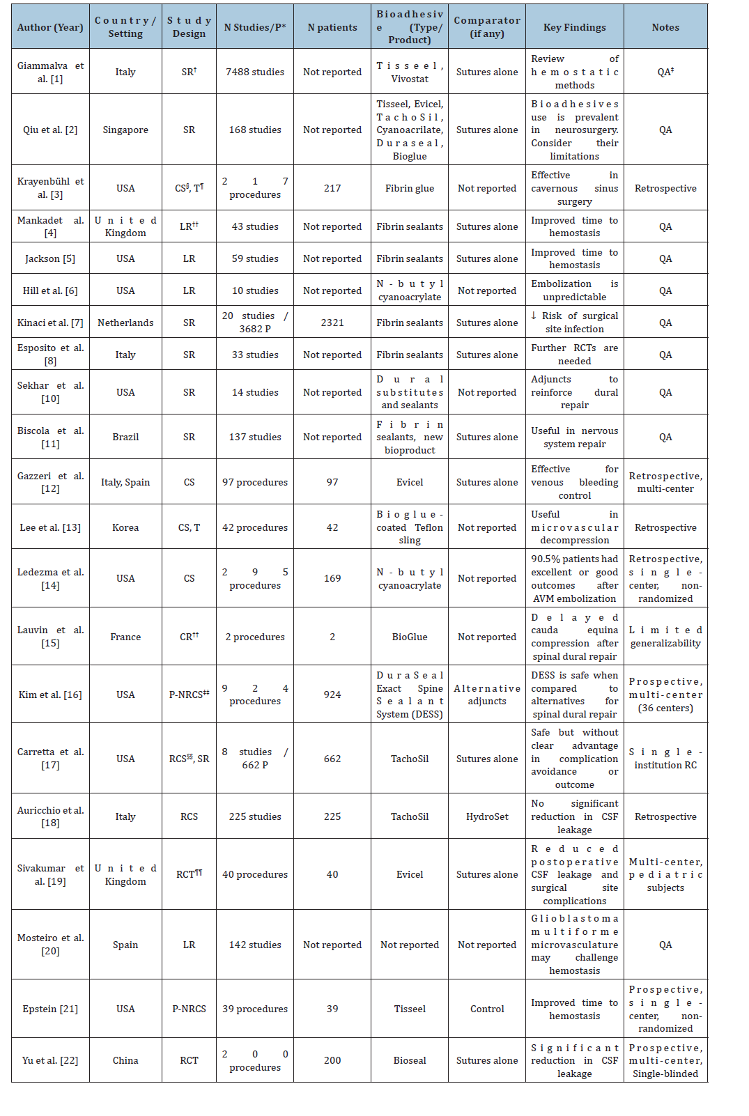 This study is, to the best of our knowledge, the first structured literature review to highlight the safety, effectiveness and potential complications associated with the use of fibrin sealants in intracranial neurosurgery. Fibrin sealants are integral to hemostasis in neurosurgical tumor resection, particularly in highly vascularized tumors and structures, where conventional techniques may be insufficient [12] While they are effective in controlling venous bleeding and improving surgical visualization, their use is not devoid of potential adverse effects. Complications such as air embolism and cranial nerve compression have been reported. What is more, glioblastoma multiforme and other highly vascularized tumors create a microenvironment that necessitates the use of fibrin sealants for hemostasis [20]. Beyond cranial surgery, fibrin sealants such as Tisseel have demonstrated benefits in spine surgery, reducing postoperative drain duration and hospital stay [21]. These findings evidence the need for fibrin sealants when seeking hemostasis but also a measured approach to their application, optimizing its hemostatic advantages while mitigating the risk of adverse outcomes. The nuanced application of fibrin sealants in neurosurgery could be re-examined. While their role in dural repair, hemostasis and even vascular procedures is well documented across systematic reviews and case series, the heterogeneity in outcomes and occasional complication profiles caution against uncritical adoption [7,9-14,17,20]. As demonstrated in prior studies, sealant efficacy is not absolute and variability in formulation, expansion properties and tissue interaction can influence outcomes in ways not always predictable [2,8,22]. In this context, this review serves as a reflection of the complexity that underpins clinical decision-making, reinforcing the need for tailored application, formulation-specific vigilance and continued investigation through prospective, controlled studies. There is a critical need for further refinement in bio adhesive technologies to enhance patient safety in neurosurgical practice. While fibrin sealants remain integral to intraoperative hemostasis and dural closure, variability in composition and performance may influence clinical outcomes. Alternative bio adhesives present a potential avenue for improving both efficacy and safety [2,8,9,22]. Sealants such as DuraSeal, although not fibrin-based, have been associated with postoperative volume expansion, a phenomenon that may contribute to parenchymal tissue compression [2,15,16]. This concern led to the development of a low-swell formulation of DuraSeal. Given the reliance on these agents in neurosurgical procedures, rigorous investigation through controlled studies and clinical trials is imperative to establish standardized, evidencebased guidelines for their optimal use.