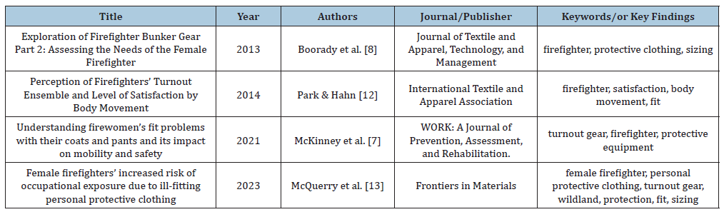 The review process began with a comprehensive search in the electronic databases of EBSCO and ProQuest. Four key terms were used in varying forms: ‘firewomen’, ‘firefighters’, ‘turnout gear’, and ‘personal protective equipment’. Boolean operators ‘AND’ and ‘OR’ were applied to ensure maximal retrieval of relevant results. The search focused on peer-reviewed articles, technical reports, and NFPA standards published between January 1, 2000, and April 30, 2023. The initial screening involved scanning titles for relevance, and any articles that did not directly investigate the relationship between firefighters and their turnout gear were omitted. Following the initial screening, the researchers scrutinized the abstracts of the remaining articles more rigorously. The selection criteria required the studies to 1) explore issues regarding sizing and fit, 2) incorporate firewomen as study participants, and 3) distinctly delineate firewomen in their findings. In the final screening phase, any articles with a sample size of fewer than 10 female participants were excluded to ensure robust statistical analyses and reliable findings. After screening, four articles were selected for the final systematic review (Table 1). For each study, the researchers collected data about female firefighters’ challenges regarding the sizing and fit of their turnout coats and pants, sample size, and study methods.