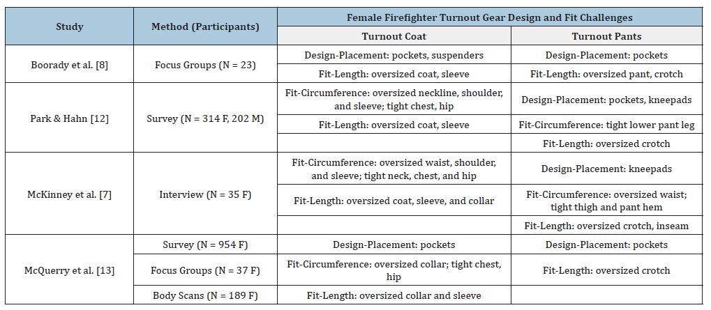 The researchers found limited studies focusing on fit issues among firefighters, particularly female firefighters. Only four articles had all participants as firefighters and had discussions on the fit and design of turnout gear in which female firefighters were the primary focus or, at minimum, were distinguished from the male firefighters as part of the results. Table 2 lists the key findings of these four articles related to design and fit challenges. In this table, “M” means male, and “F” means female.