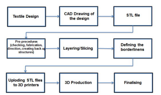 The design and production process with three-dimensional printers begin with determining the intended purpose of textile and modelling studies. In the second stage, threedimensional drawings of textile design are being prepared in the features and sizes set by the appropriate CAD programs. Then, the created designs are converted into the STL file format. The STL file format is “an unsorted triangle surface list that represents the outer surface of the design” [2]. The data contained in this file is subjected to some pre-processing, such as error checking and building direction, creating support structures if necessary [3].