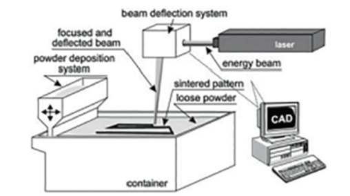 Selective Laser Sintering (SLS): This approach uses a laser to selectively fuse powdered material together to form the object. This is often used for creating functional parts and components. Figure 3 shows a schematic representation of SLS printing [7], and this method is also known as powder fusion. The SLS technique uses thermoplastic materials such as polyamide, polystyrene, elastomers and composites. The remaining powders can be reused. The positive sides of the technique are great freedom in design, durable products, while the disadvantage is poor surface treatment and high price [6].