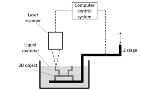 Stereolithography (SLA): This technique uses a liquid resin that is solidified layer by layer using a laser or UV light. This is a popular tool for creating high-detail prototypes, small-scale production runs, and jewelry accessories. The schematic diagram of the SLA 3D printer is shown in Figure 4 [8].