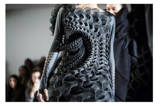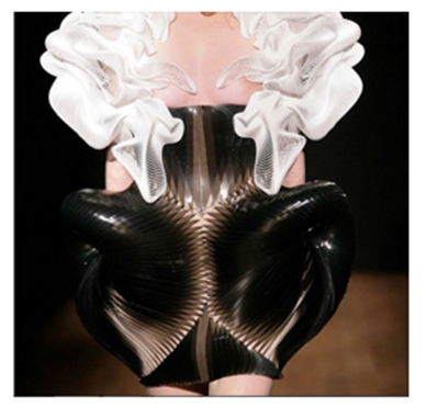 Iris van Herpen is a Dutch designer known for her futuristic, scifi aesthetic that mixes with natural motifs. Her marvelous creations are pure art that unites fashion, science and technology. In 2011, she made a splash when she debuted a 3D printed dress, one of her first 3D printed pieces, at Paris Haute Couture Week [10]. Van Herpen was the first designer to introduce 3D printed fashion on the runway. Since then, 3D printing has become a popular new tool in the fashion industry for major designers, who create garments with geometric shapes as well as solid and shiny embellishments. The white parts are made of polyamide and are made by a selective laser sintering process. The black part is also 3D printed from polyamide and finished with black lacquer (Figure 5).