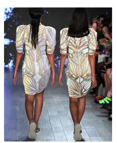 The fashion house, three ASFOUR presented at the 2019 New York Fashion Week its “Chro-Morpho” collection created using a new style of 3D printing directly on fabric [13]. Until then, clothing was mostly either fully printed or assembled after printing. Direct 3D printing onto fabric opens up a whole new world of possibilities, especially when it comes to creating stylish, functional wearables. Working in collaboration with Stratasys and Travis Fitch, three Asfour’s fashion designers created its Chro-Morpho collection, which took the NYFW runway by storm. The collection, inspired by the iridescent and microscopic colors created by light filtering through butterfly and insect wings, was created using a novel technique of 3D printing directly onto fabric (Figure 9).