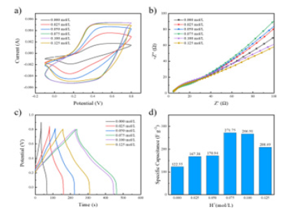 Figure 10a shows a different H+The CV curve of the PANI / CFs electrode material was prepared by concentration, as shown in Fig, and the CV curve with H+The concentration increase showed regular changes. The area of the CV curve of PANI / CFs electrode materials with H+The doping concentration increases, when H+At concentrations of 0.075mol/L and 0.1mol/L, the two groups had large and similar CV curves, with better electrochemical properties. equal H+The area of the CV curve decreases when the concentration increases to 0.125mol/L. Figures 10b are the different H+EIS curves of electrode materials of PANI / CFs. As shown in Fig, along with the H+As the concentration increases, the trend of the semicircle radius in the high frequency area in the curve is not obvious, and the slope of the curve in the low frequency region increases first and then decreases. equal H+The slope of the line is maximum at a concentration of 0.075mol/L. Combine the GCD curve and the corresponding specific capacitance value of PANI / CFs electrodes and comprehensively evaluate the capacitance performance, as shown in Figure 10c-d, with the same trend as the CV curve results, when H+At a concentration of 0.075mol/L, the PANI / CFs electrode material had the longest discharge time and the corresponding area ratio capacitance value, indicating its superior electrochemical properties.