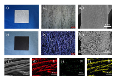 .Morphological analysis of the PANI / CFs electrode materials: Figure 11 shows the macroscopic and microscopic morphology of the CFs substrate and PANI / CFs electrode materials. See Figure 11a-a2 as shown, the substrate of CFs shows white features in appearance, with the white fiber network interwoven under optical microscope and the fiber surface polished under scanning electron microscope. After in situ polymerization of PANI, as shown in Figure 11b-b2, the appearance of the PANI / CFs electrode material shows black features, and the cotton fiber coated with PANI shows blue-purple under the optical microscope. For further observation, the PANI load on the CFs substrate can be visually seen under the scanning electron microscope. Figure 11c-f shows the EDS mapping image of the PANI / CFs electrode material. C and O elements mainly come from cotton fiber substrate, and N element, as PANI characteristic element, its distribution reflects that PANI is relatively evenly loaded on CFs, but the load is small.